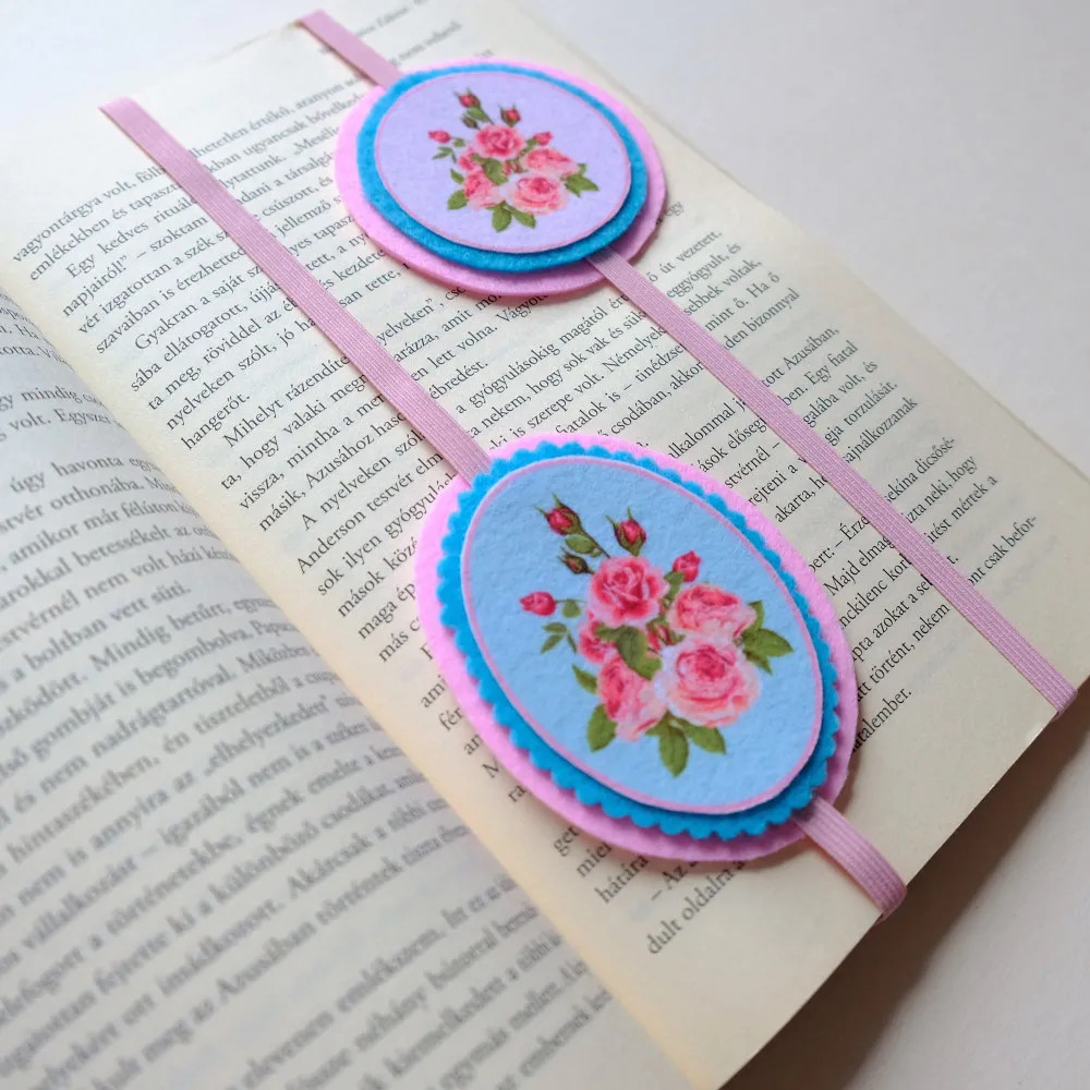 Ebből a kreatív csomagból egy kör alakú és egy ovális alakú rózsás könyvjelző készíthető.