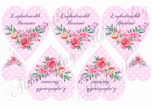 Rózsás szívek pöttyös alapon - LEGKEDVESEBB BARÁTNŐ felirattal - 12,5 x 11 cm - Több mint 20 alapanyagon elérhető.