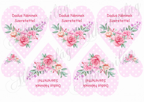 Rózsaszín pöttyös szív rózsával - Dadus néninek szeretettel felirattal - Több mint 20 alapanyagon elérhető.