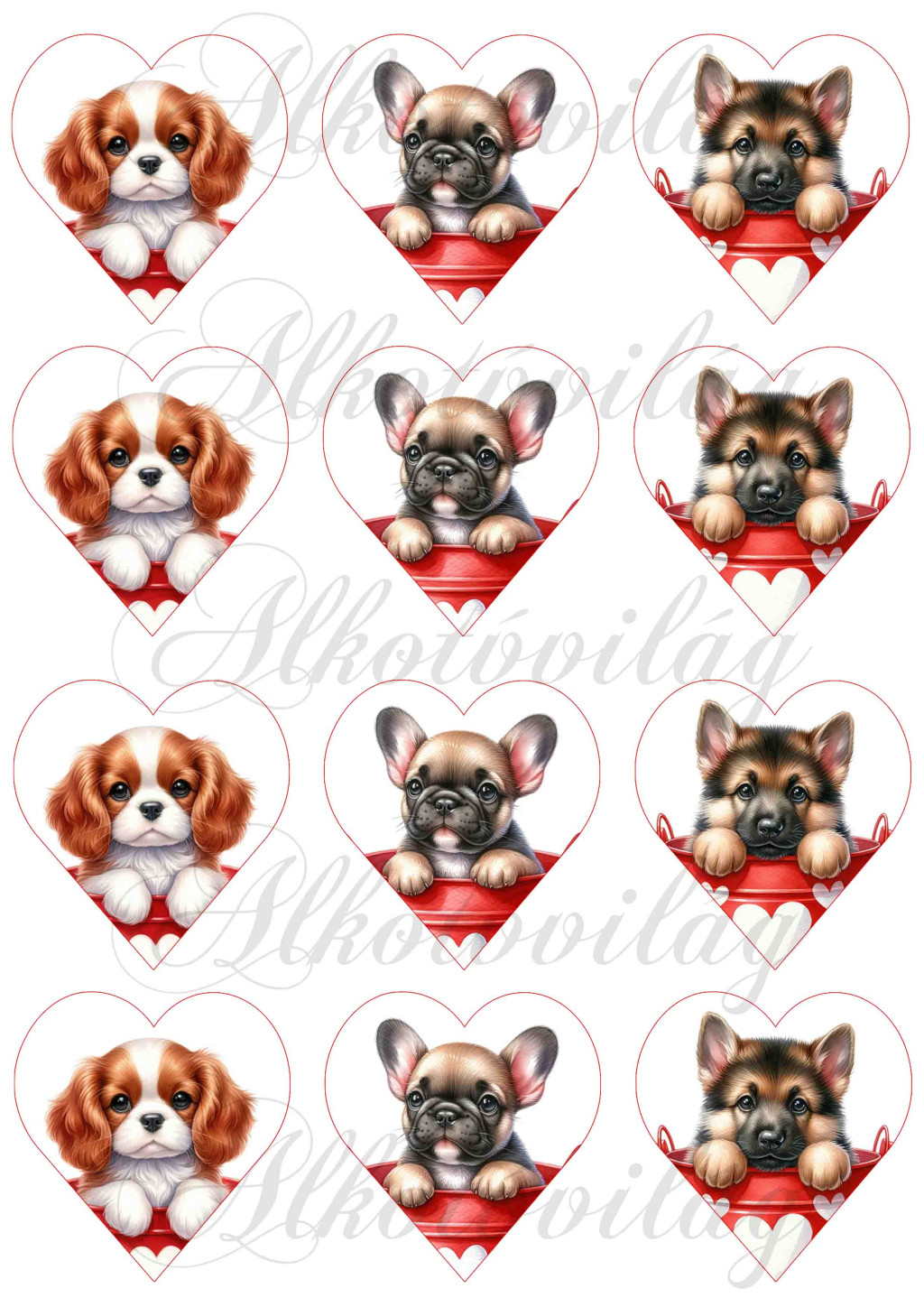 Spániel, bulldog, németjuhász kutyusok 6 cm magas szíveken