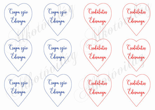 Szívek - 6 cm kék, piros kerettel, Csupa szív Édesapa, Csodálatos Édesanya feliratokkal - Több mint 20 alapanyagon elérhető.
