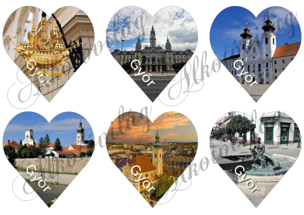 Szívek GYŐR nevezetességeivel és felirattal- 9 cm magas