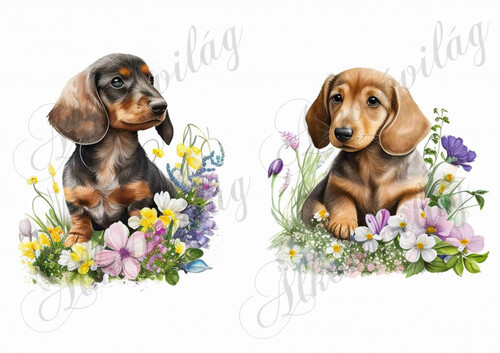 Tacskó kutyusok virágokkal - Több mint 20 alapanyagon elérhető.