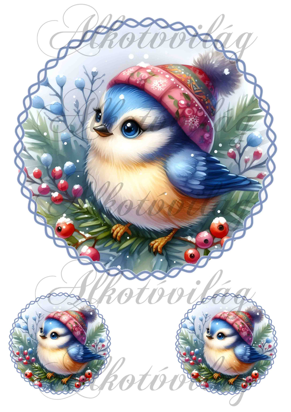 Téli kismadár piros bogyós ágon 18,5 cm körben