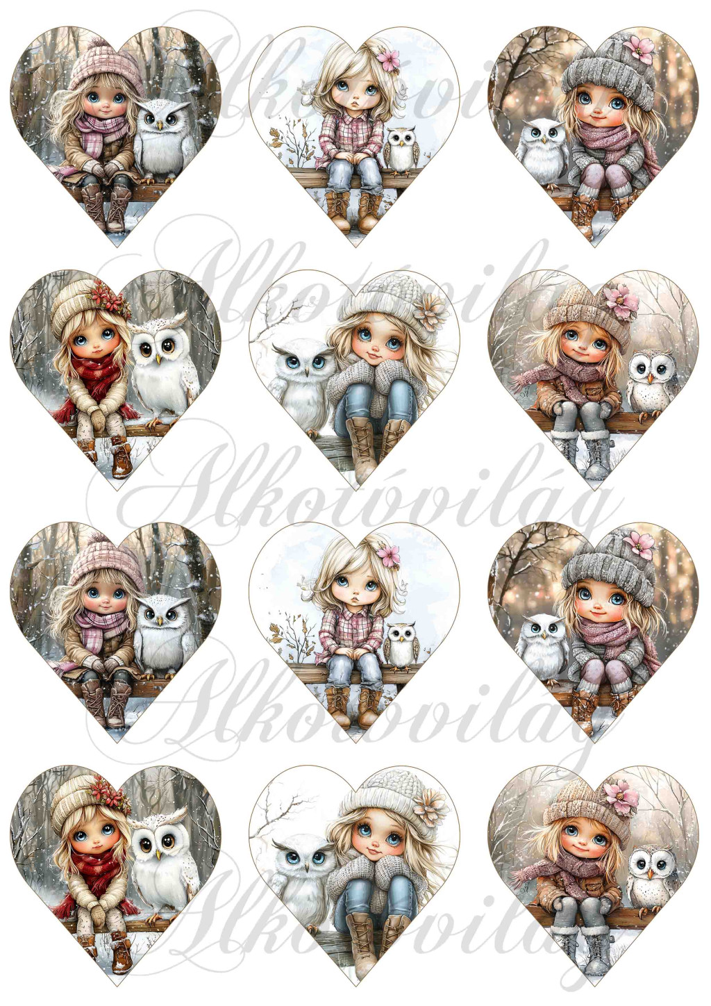 Tüneményes kislányok cuki baglyokkal 2. változat - 6,5 cm magas szíveken