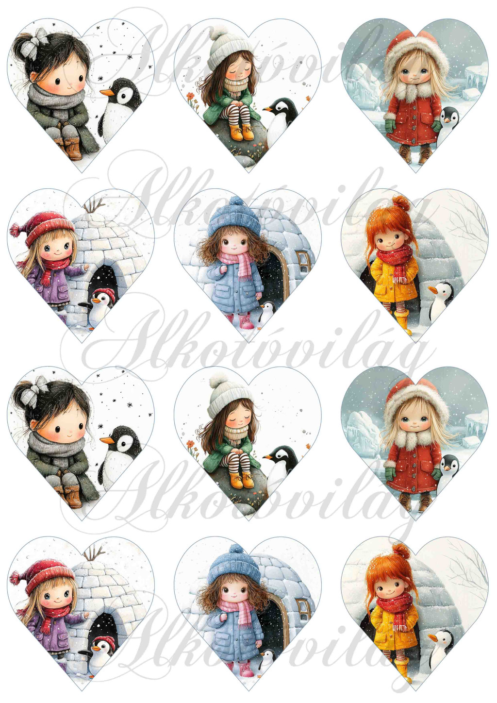 Tüneményes kislányok cuki pingvinekkel - 6,5 cm magas szíveken