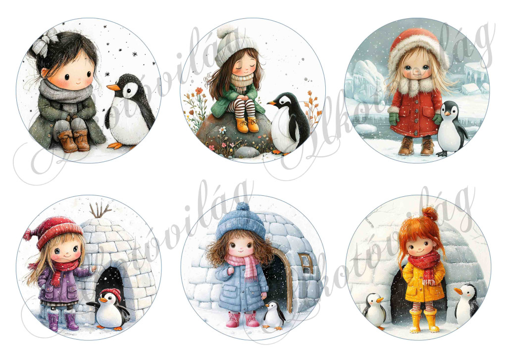 Tüneményes kislányok cuki pingvinekkel - 8,5 cm átmérőjű körökön