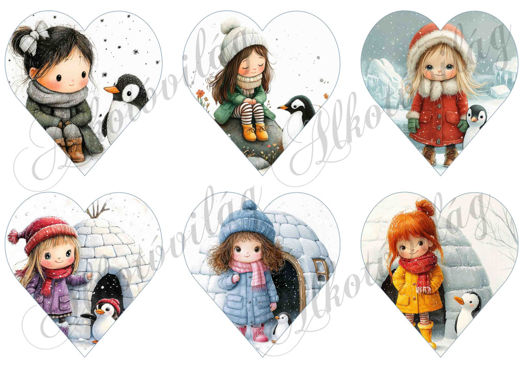 Tüneményes kislányok cuki pingvinekkel - 9 cm magas szíveken