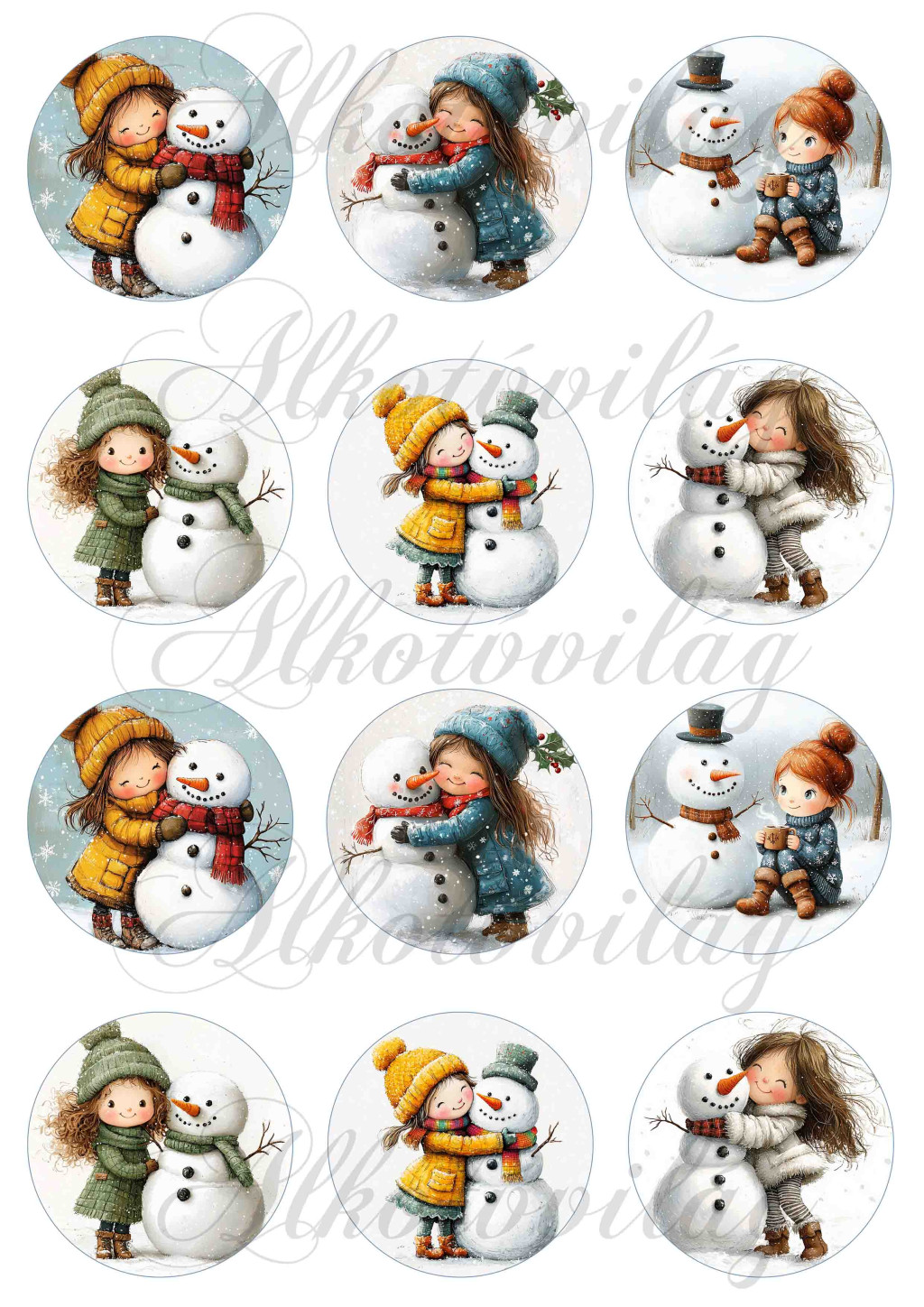 Tüneményes kislányok kedves hóemberekkel 2. változat - 6 cm átmérőjű körökön