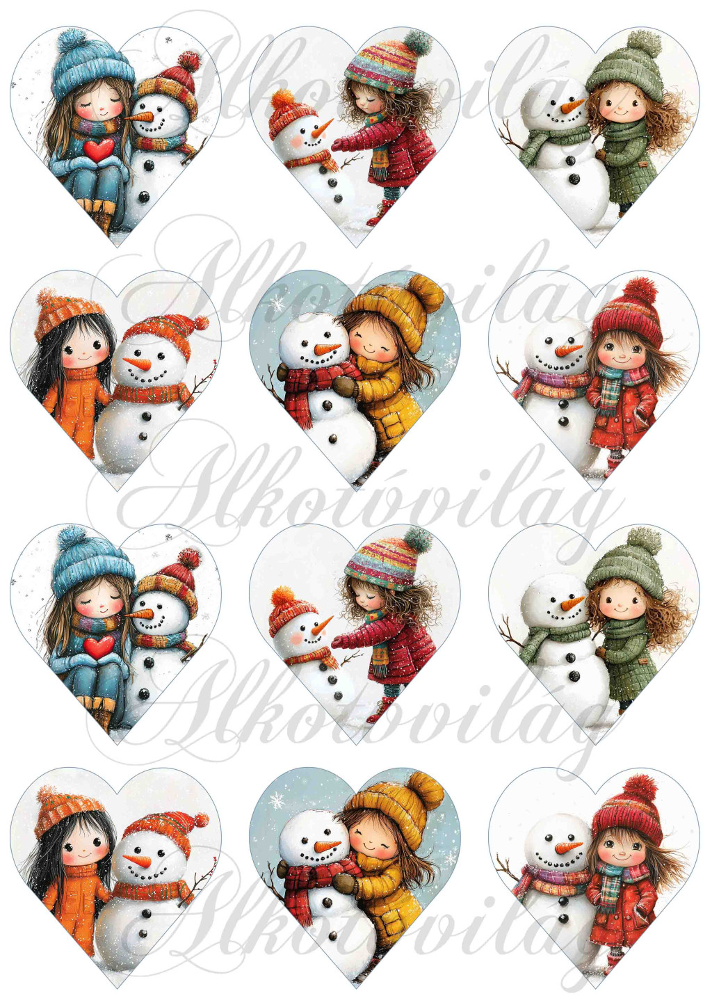 Tüneményes kislányok kedves hóemberekkel - 6,5 cm magas szíveken