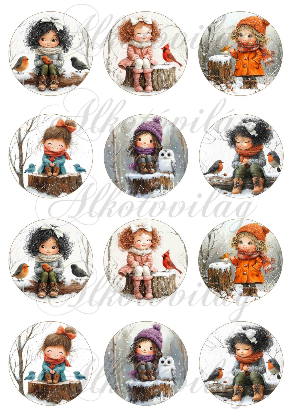 Tüneményes kislányok kismadarakkal 2. változat - 6 cm átmérőjű körökön