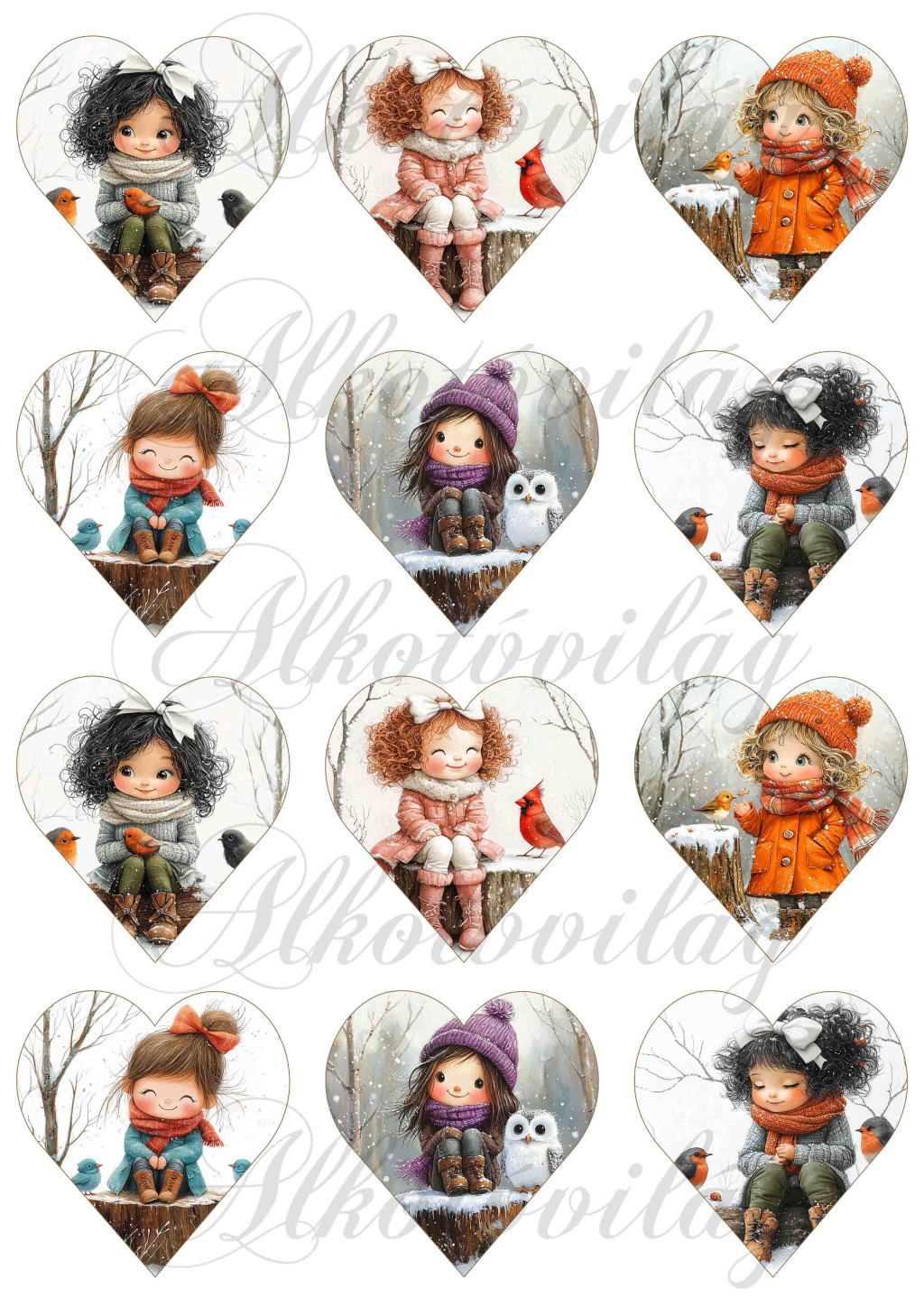 Tüneményes kislányok kismadarakkal 2. változat - 6,5 cm magas szíveken