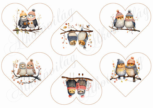 Tüneményes kismadár párok sapkában ágon, 8,5 x 10 cm-es szívekben