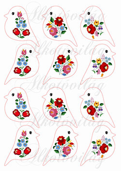 Tüneményes kismadarak kalocsai mintákkal - 6x7 cm - Több mint 20 alapanyagon elérhető.