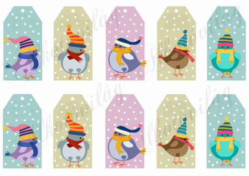 Tüneményes kismadarak sapiban, hóesésben üdvözlőkártyákon - Több mint 20 alapanyagon elérhető.