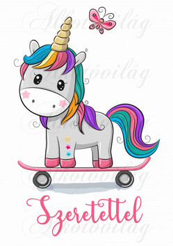 Unikornis gördeszával, SZERETETTEL felirattal - Több mint 20 alapanyagon elérhető.