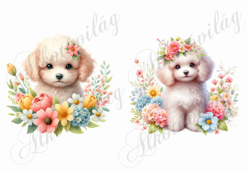 Világos szőrű uszkár kutyusok virágokkal és pillangókkal - kb. 12 x 12 cm - Több mint 20 alapanyagon elérhető.