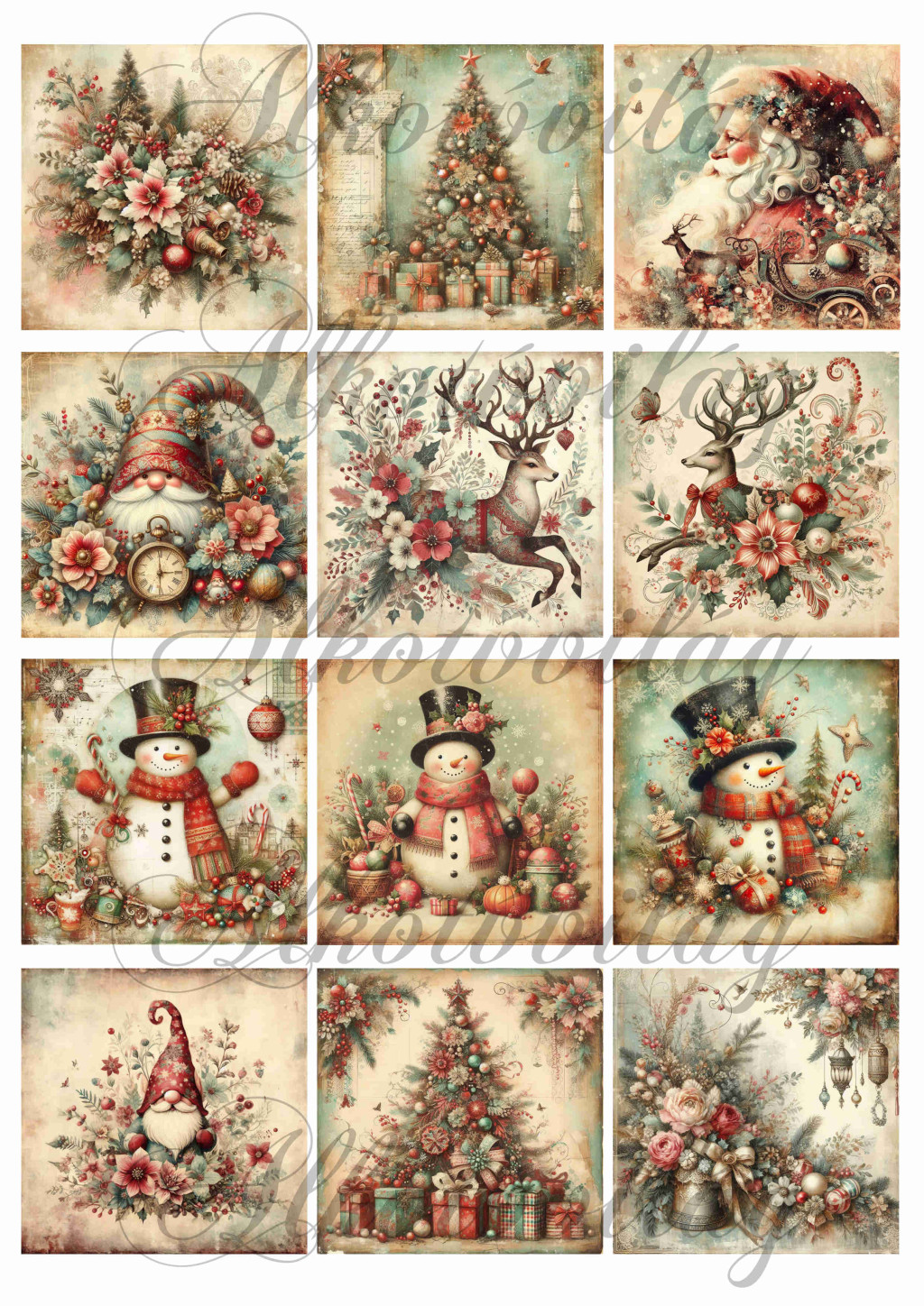 Vintage kártyák karácsonyi mintákkal - mikulás, karácsonyfa, manó, szarvas, hóember - 6,5 x 6,5 cm - Több mint 20 alapanyagon elérhető.
