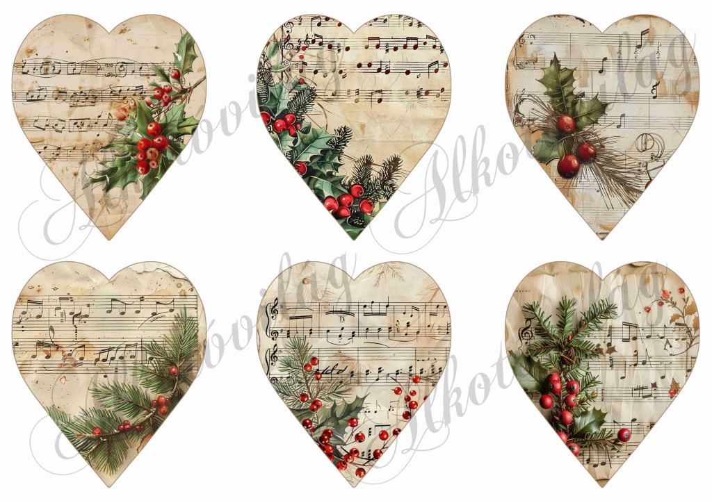 Vintage szívek kottával, magyallal - 9 cm magas - Több mint 20 alapanyagon elérhető.
