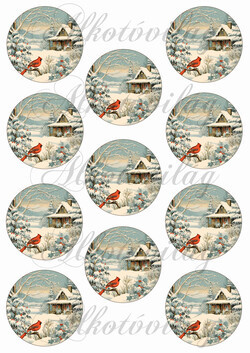 Vintage téli táj házikóval, kismadárral - 6,5 cm körökben - Több mint 20 alapanyagon elérhető.