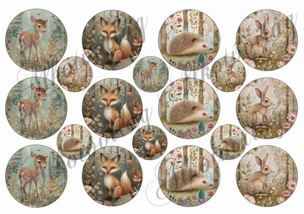 Woodland - cuki állatkák virágokkal 6 és 3,5 cm-es körökben - VASALHATÓ FÓLIA