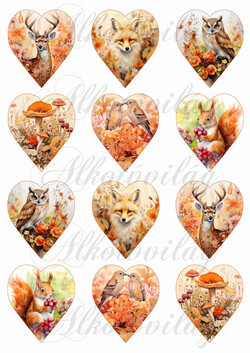 Szívek állatkákkal őszi színekben - 6,5 cm magas - Több mint 20 alapanyagon elérhető.