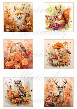 Őszi képek állatkákkal, róka, mókus, kismadár, bagoly, szarvas 8 x 8 cm négyzetekben - Több mint 20 alapanyagon elérhető.