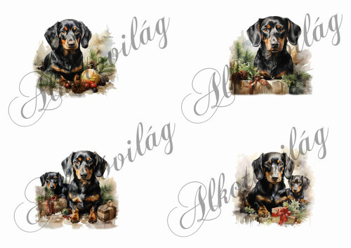Tacskó kutyusok karácsonyi díszekkel- kb. 7,5 cm - 9 cm átmérőjű hímzőkerethez - Több mint 20 alapanyagon elérhető.
