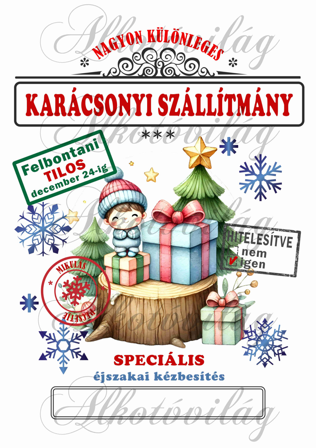 Mikulászsák karácsonyi ajándékok farönkön karácsonyfákkal - december 24-re
