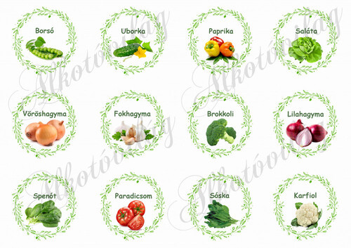 Zöldségek zöld leveles keretben - Több mint 20 alapanyagon elérhető.