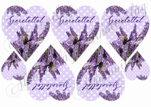 Levendulás szívek pöttös alapon - SZERETETTEL felirattal - Több mint 20 alapanyagon elérhető.