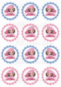 Cuki kislány rózsaszín pöttyös kalappal kék és rózsaszín cakkos körökben KICSIBEN