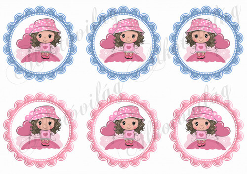 Cuki kislány rózsaszín pöttyös kalappal kék és rózsaszín cakkos körökben - Több mint 20 alapanyagon elérhető.