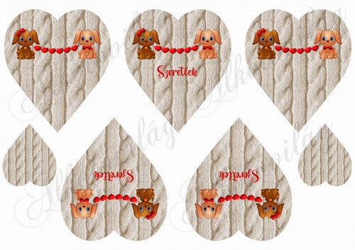 Kutyusok szív füzérrel kötött mintás szíveken - Több mint 20 alapanyagon elérhető.