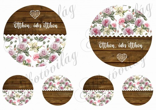 Otthon édes otthon felirat fa és rózsás mintás körökön - Több mint 20 alapanyagon elérhető.