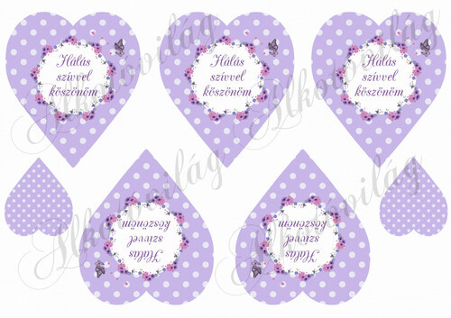 Lila alapon pöttyös szívek koszorúval - HÁLÁS SZÍVVEL KÖSZÖNÖM felirattal - Több mint 20 alapanyagon elérhető.