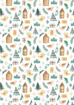 Kézzel festett skandináv szett zöldes-sárgás színben - Kismadár, fenyő, ajándékdoboz, ház, karácsonyfadísz
