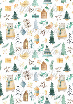 Kézzel festett skandináv szett zöldes-sárgás színben - Maci, kismadár, fenyő, ajándékdoboz, ház