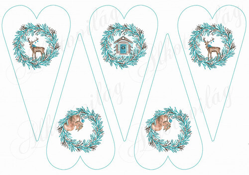 Karácsonyi mintás készlet kék-barna színekben - szarvasok, házikók, őzikék hosszúkás szíveken