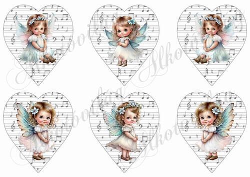 Tüneményes angyalkák türkiz ruhában halvány kottás háttérrel - 9 cm magas - Több mint 20 alapanyagon elérhető.