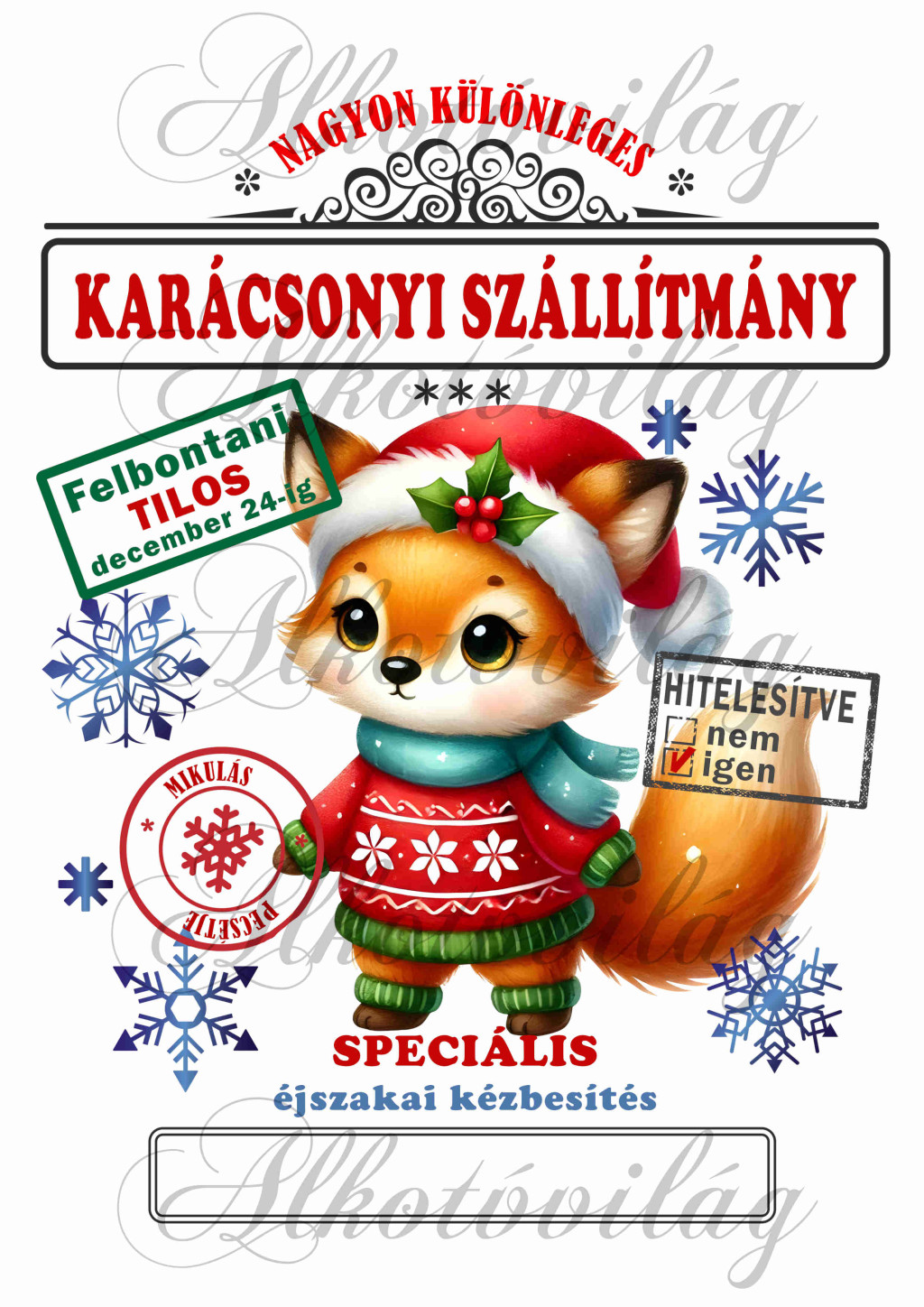 Mikulászsák ártatlan, aranyos róka karácsonyi ruhában, kék sálban - december 24-re