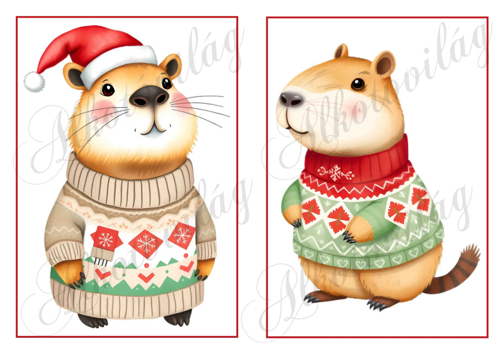 Cuki capybara figurák karácsonyi kötött pulcsiban 19 x 13 cm-es keretben