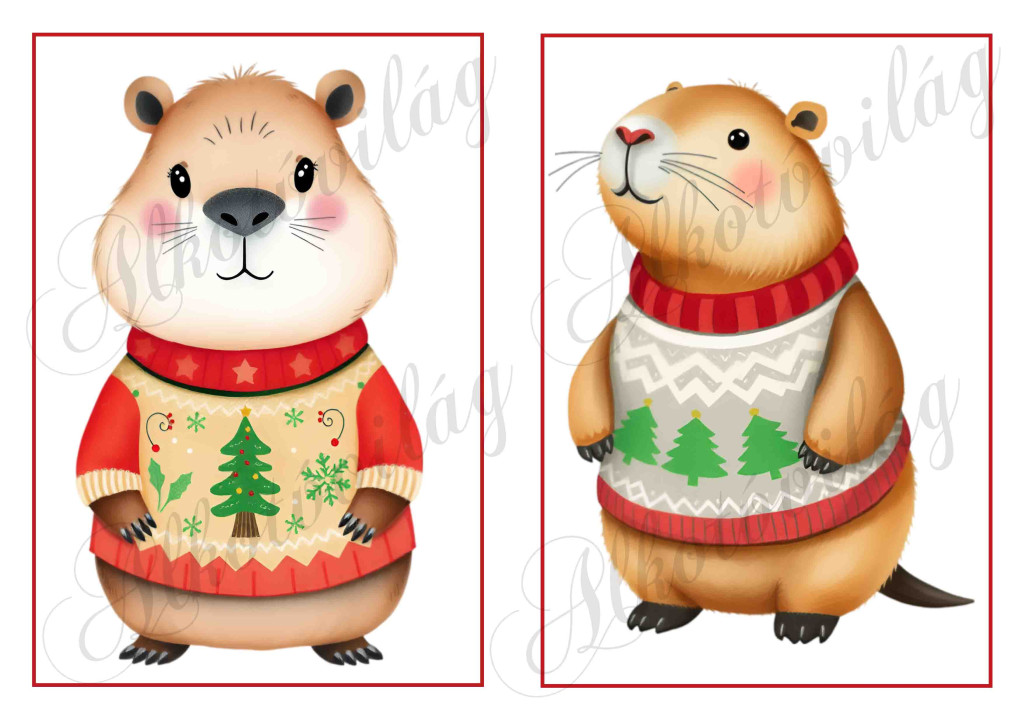 Cuki capybara figurák karácsonyi kötött pulcsiban 5 - 19 x 13 cm-es keretben