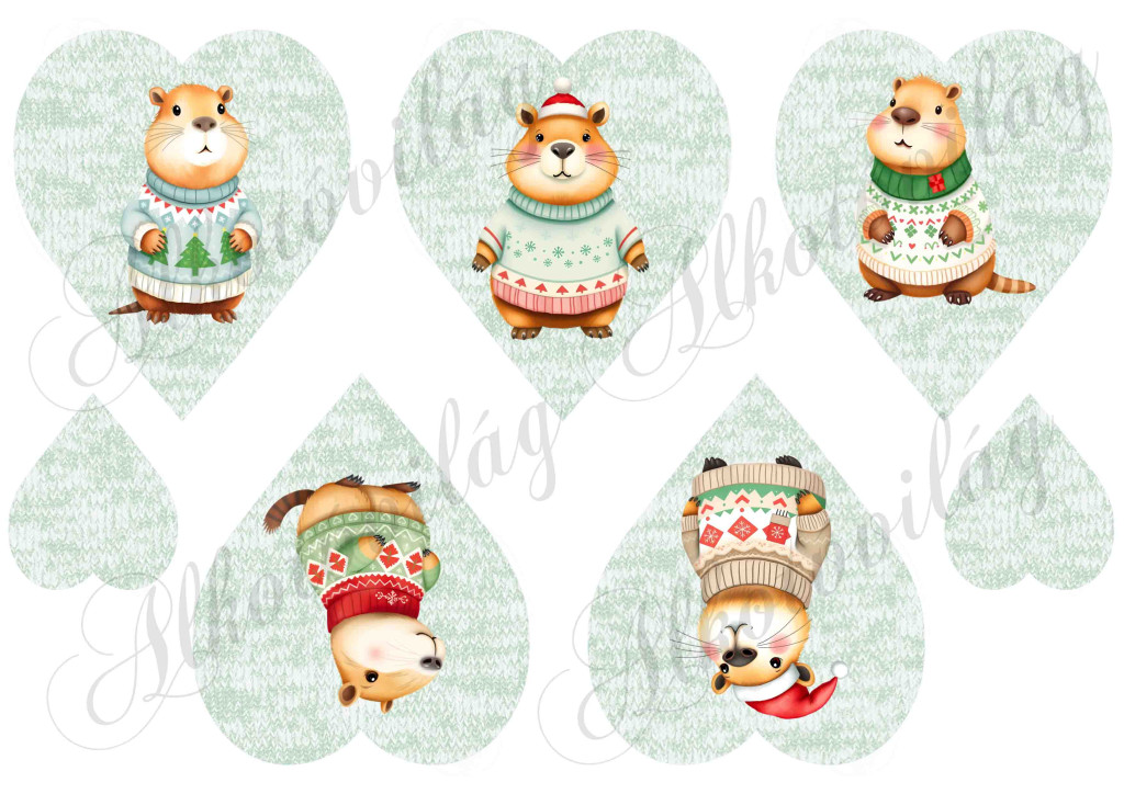 Cuki capybara-k karácsonyi kötött pulcsiban - 10 cm magas zöld - kötött szíveken
