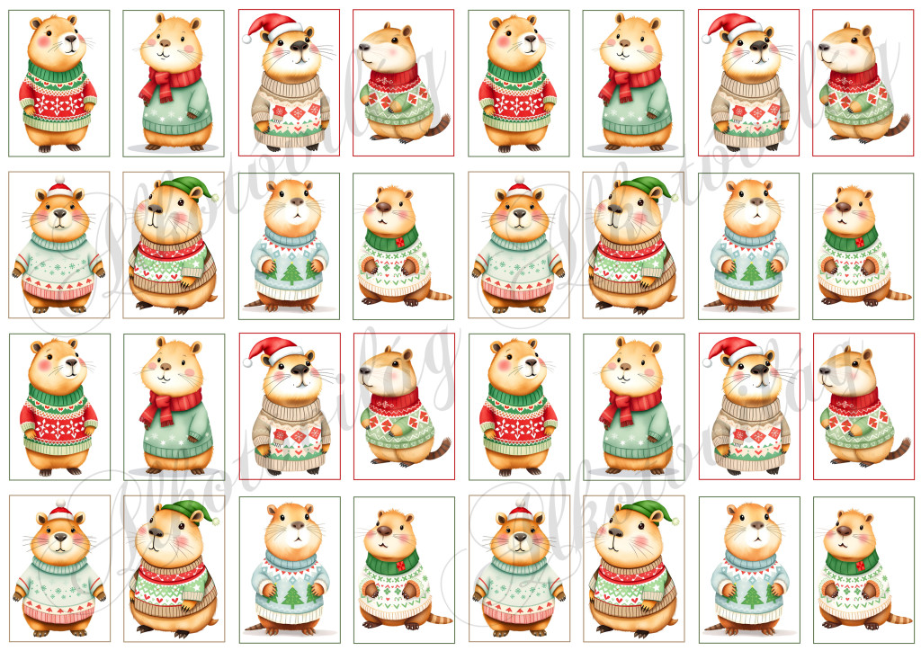 Cuki capybara figurák karácsonyi kötött pulcsiban - 3 x 4,5 cm-es keretben