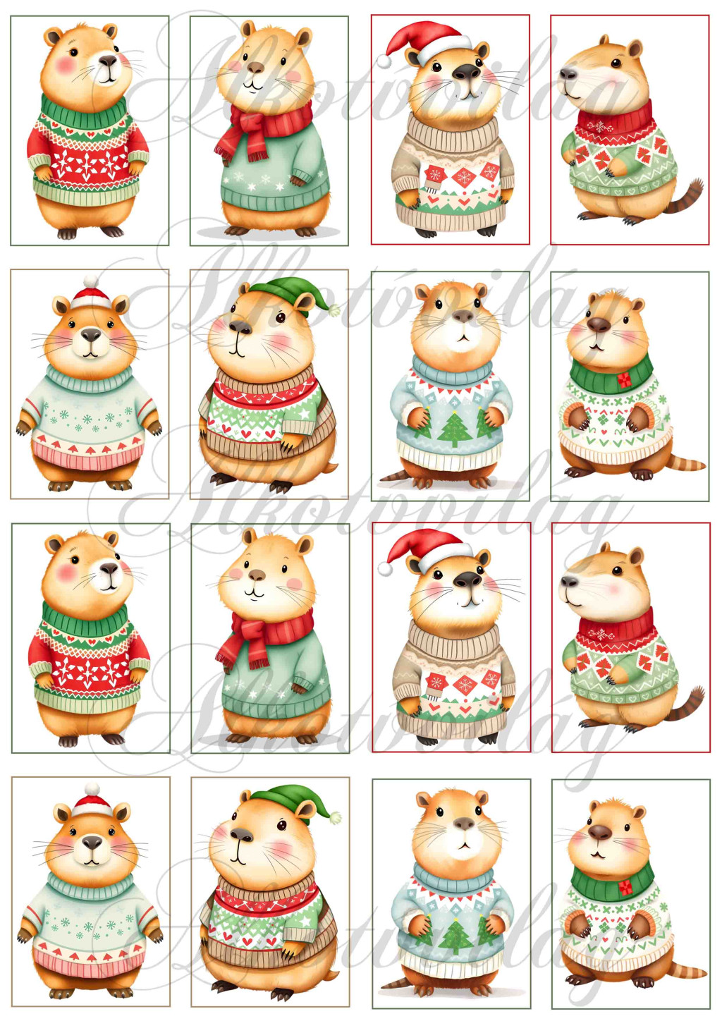 Cuki capybara figurák karácsonyi kötött pulcsiban - 6,5 x 4,5 cm-es keretben