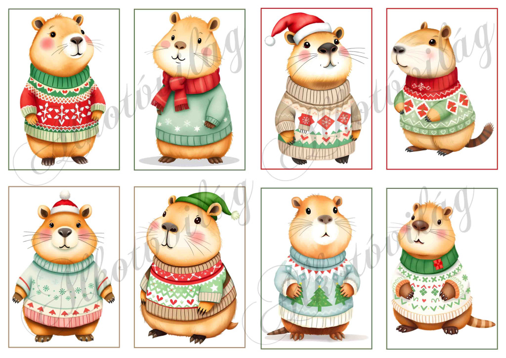 Cuki capybara figurák karácsonyi kötött pulcsiban - 9 x 6,5 cm-es keretben