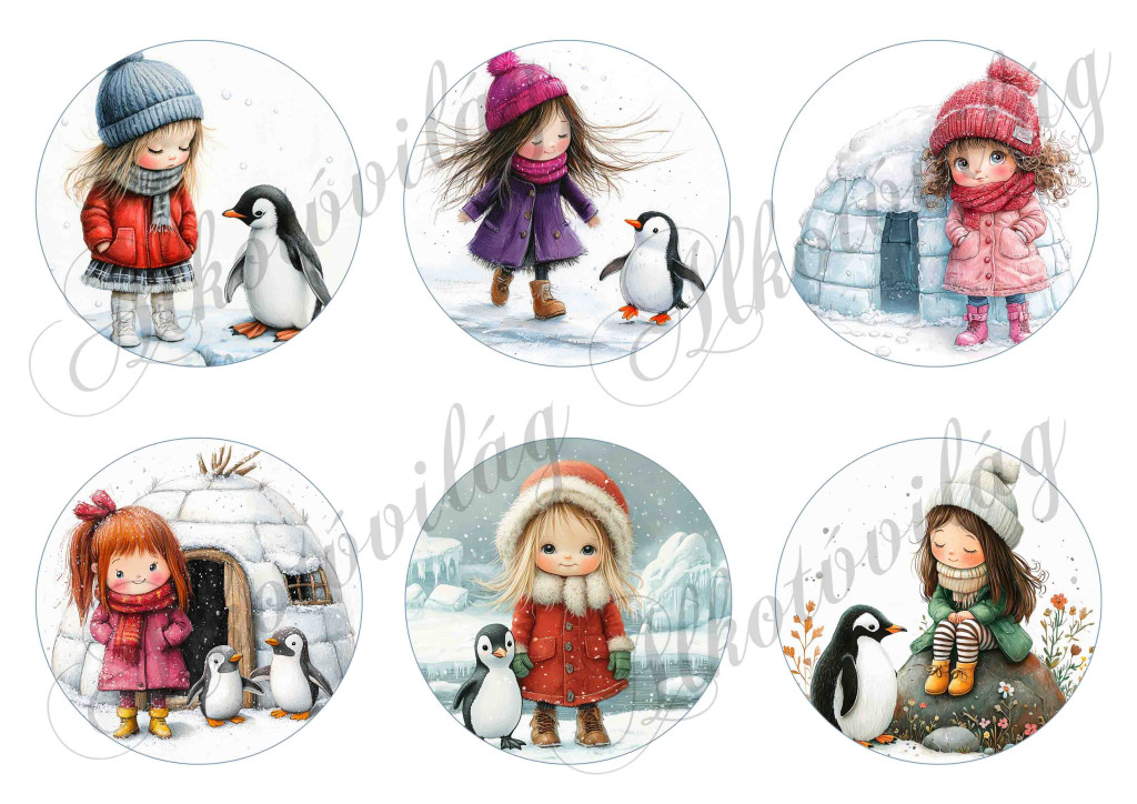 Tüneményes kislányok cuki pingvinekkel 2. változat - 8,5 cm átmérőjű körökön