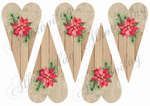 Hosszúkás szívek fából és textilből mikulásvirágokkal - Több mint 20 alapanyagon elérhető.