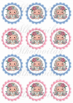 Cuki angyalka rózsás fejdísszel kék és rózsaszín cakkos körökben KICSIBEN